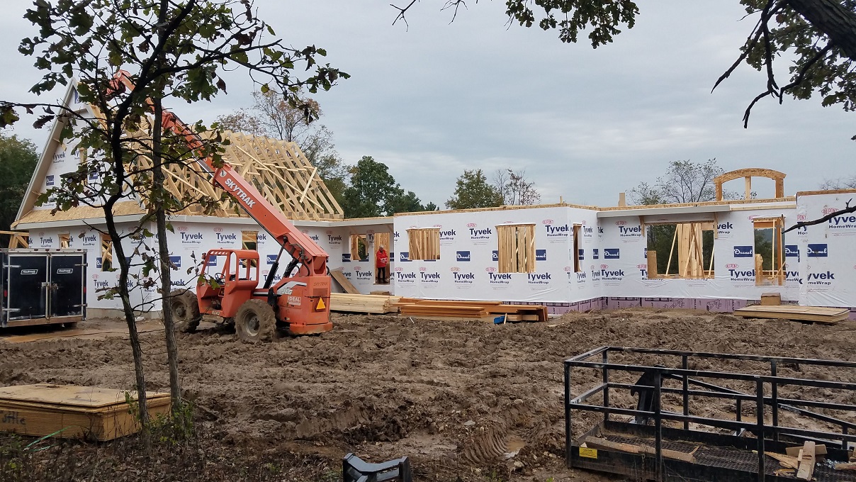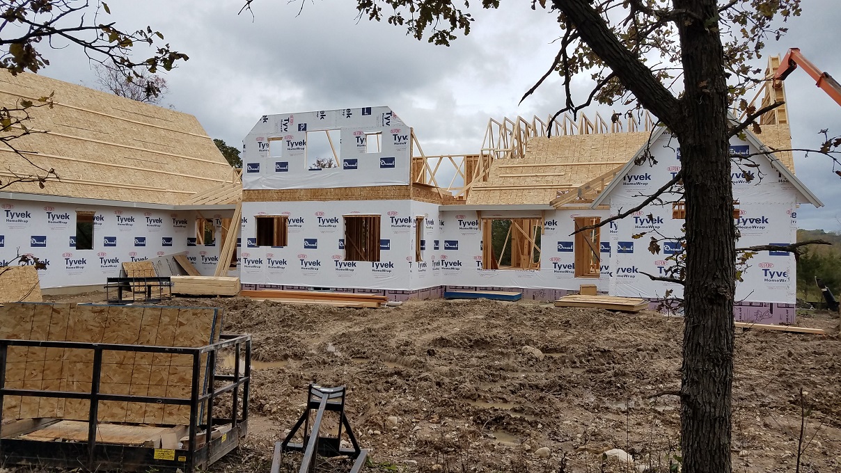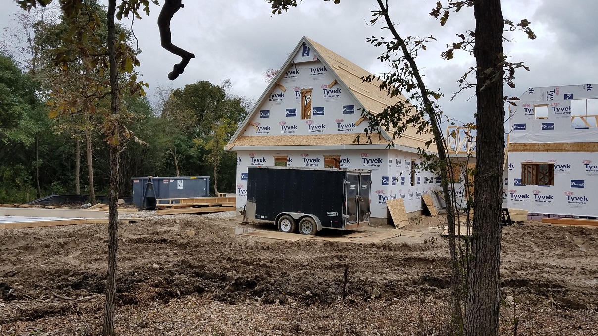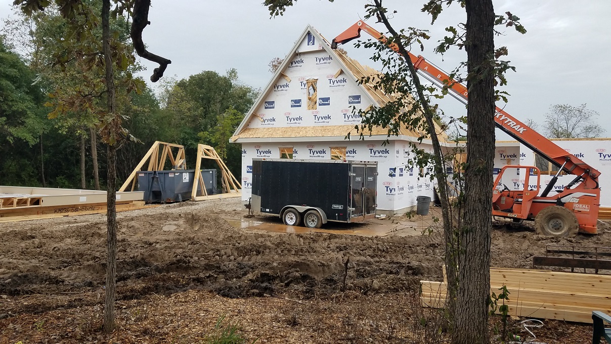 Not much to really say at this point with more walls going up and trusses set into place, except WOW! So much happens in one weeks time. They had one full week of working between raindrops and then the next week they lucked out and had lots of sun. Every time we stop by the house and see the progress we start imagining more and more of how the house will look. Once again, Craig from James Craig Builders did say that the house will go through phases of looking small then big then small and so on. At this point, things look a little small until you start measuring things out. For instance, our Master Bedroom looked tiny. We were really worried until we went back with a tape measure and measured out our King size bed. All is well. So don’t panic during this phase. Take it as it comes but this a good time to really start looking around and making notes about things you notice that you aren’t quite sure about or notes on where you might be putting things. We noticed a window that was in a place for no rhyme or reason. We asked to have it removed from the plan and all is well. The windows were already ordered but we will keep it for something as we already paid for it.