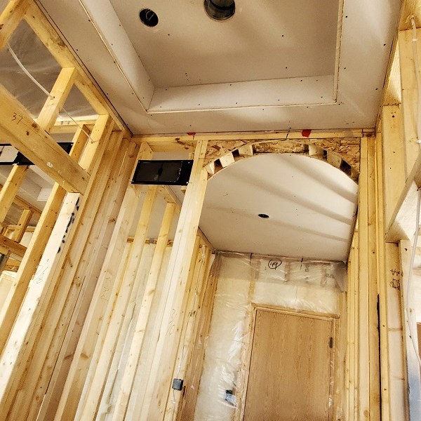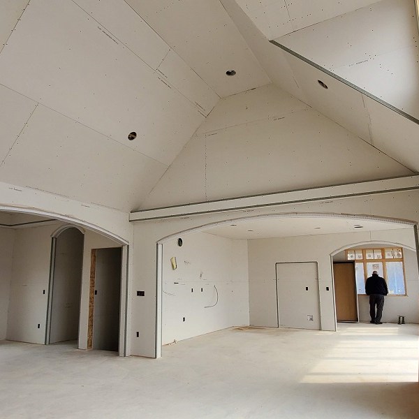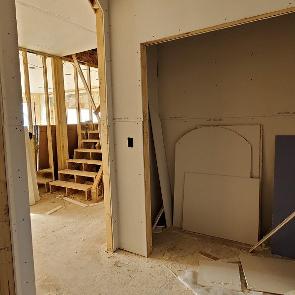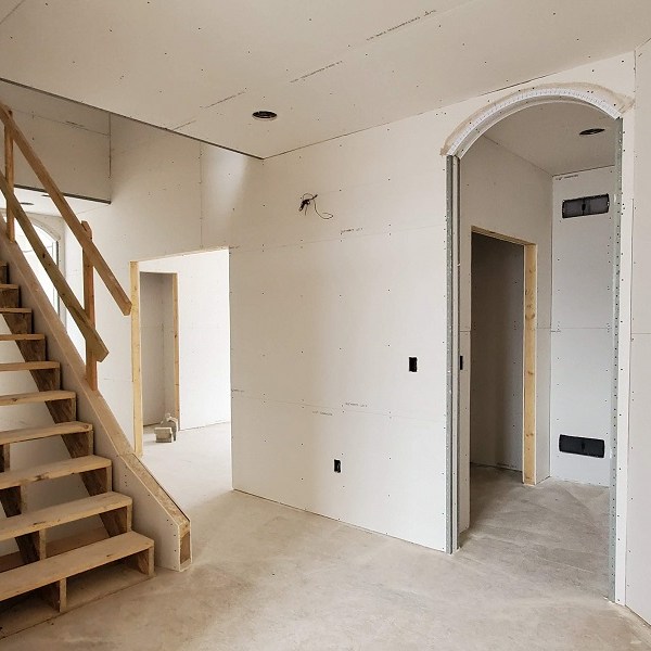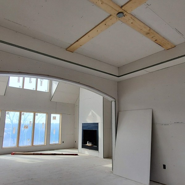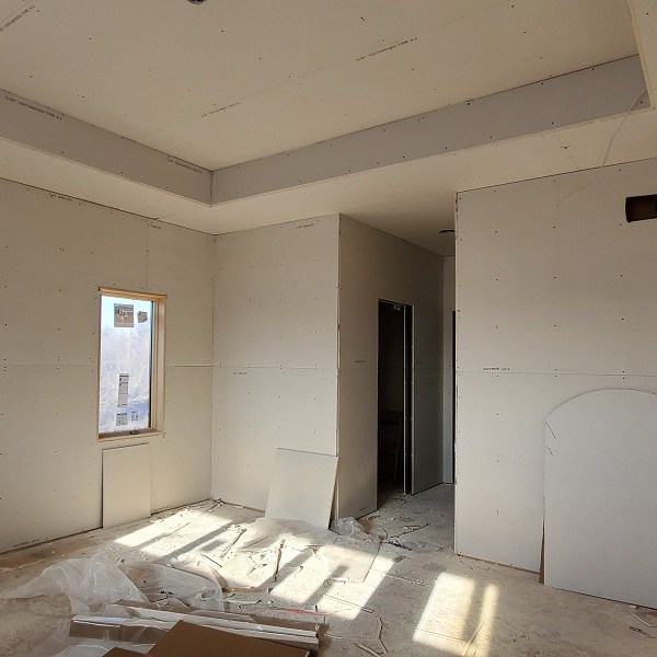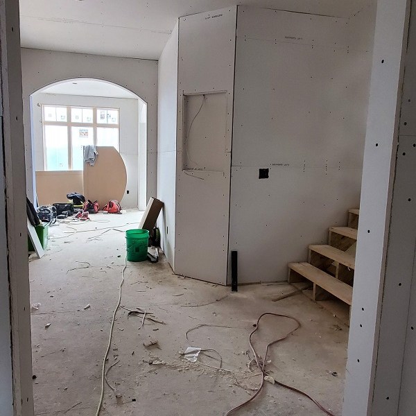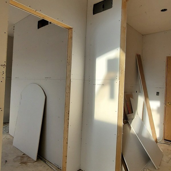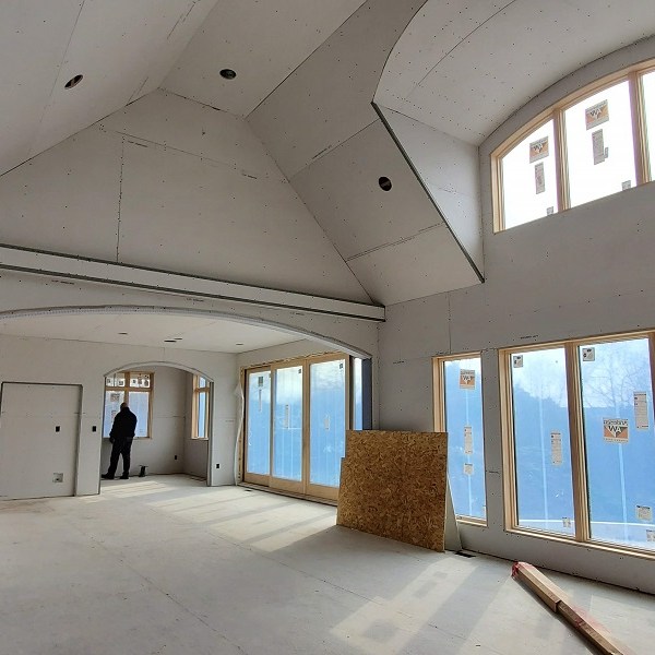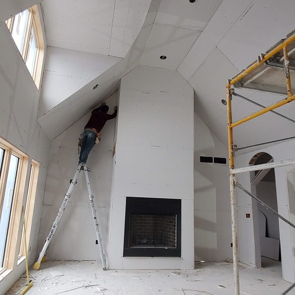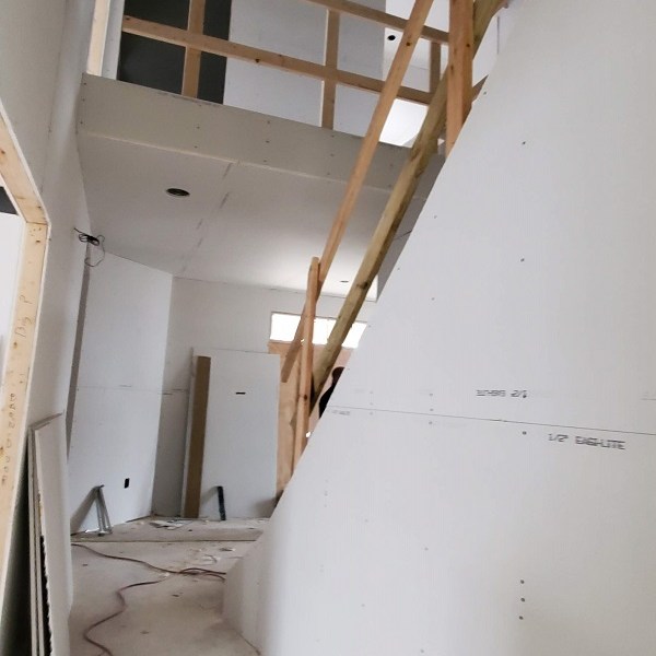 The drywall (Rockers as they call them) was started on April 17, 2020. This is just the first step of the three plus week process to complete the walls for painting. We were amazed by how much drywall was stacked everywhere AND that they had to bring it all in by hand! Crazy!! I didn’t get the name of the company but these guys were super nice and worked fast. Like I have done with the rest of the people working on the house, I apologized. All those steep vaulted ceiling, niches and arches, I’m sure this house is either their worst nightmare or a wonderful challenge. I took pictures during the process so I could record the progress. From our experience, they first did all the ceiling in each room and closet along with a few harder spots. Then they started working on the upstairs and a few of the smaller rooms downstairs. The blue sheet rock is for the bathrooms and dealing with humidity. Then they tackled the large rooms and the living room. They had quite a good system going. As one guy was yelling out numbers in Spanish, another would be cutting pieces, sanding the edge and then handing it to the guy that asked for it. Boom, Boom, Boom!